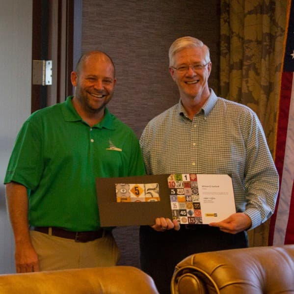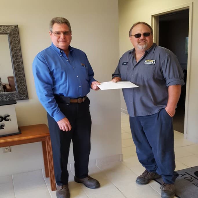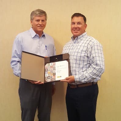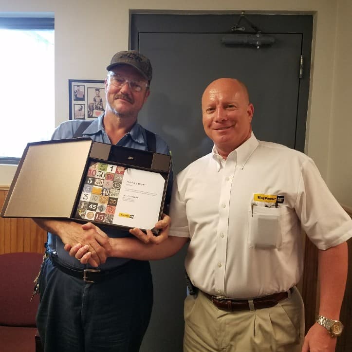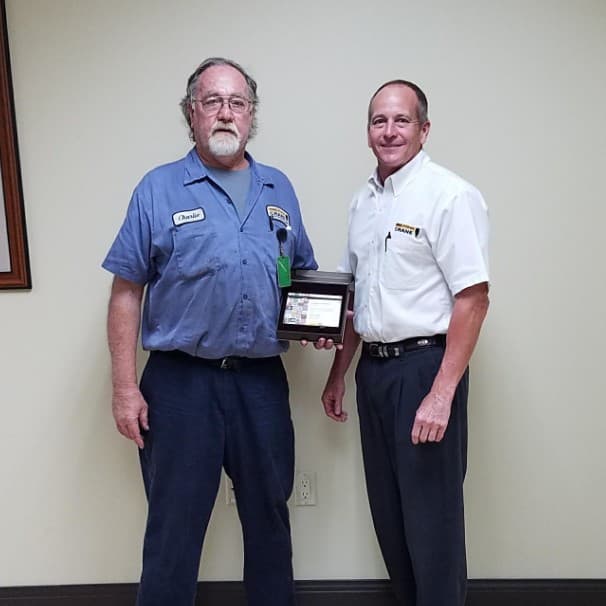 Paul Spry (NC Master Crane Tech), right, receiving his award from Joe Mangum for completing 5 years of service July 8.