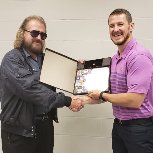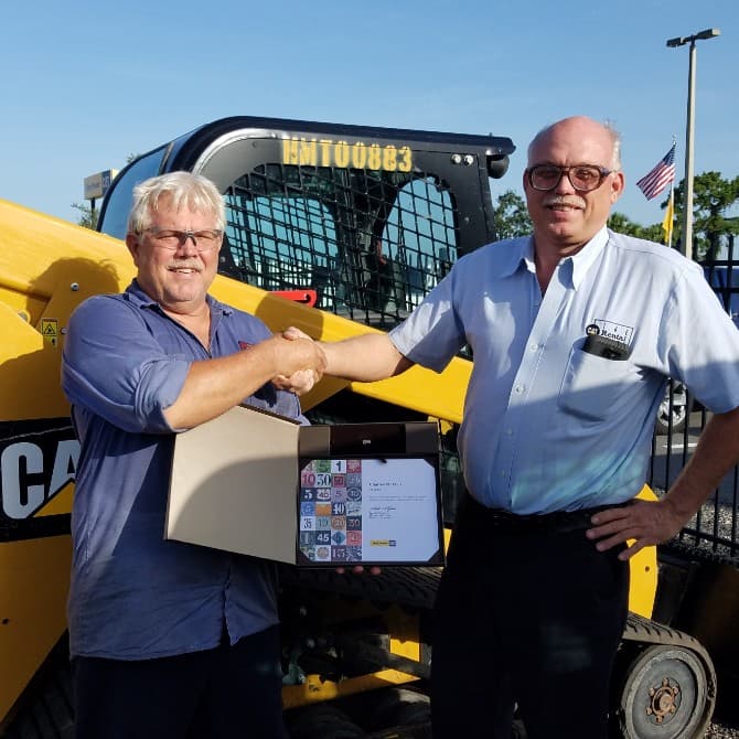 Frank Hallock, winner of the Lakeland Demo Day social media contest, picks up his prize with Tampa Cat Rental Store Inside Sales Rep., Charles Davis