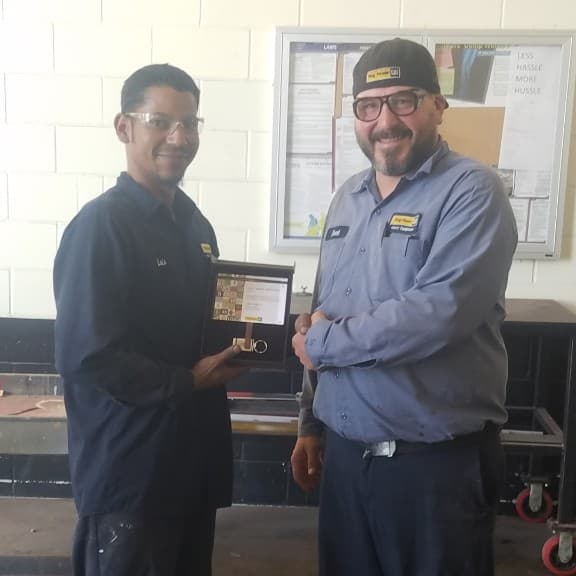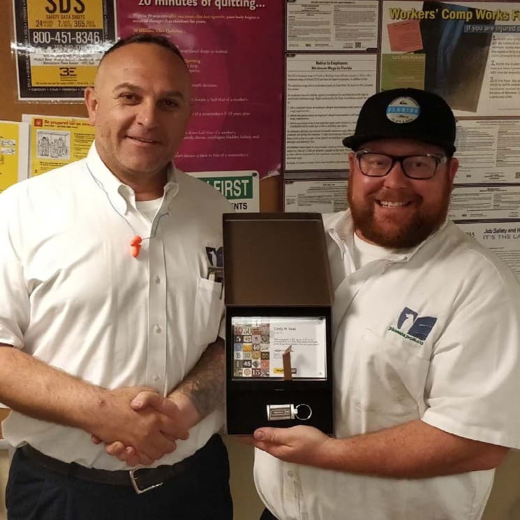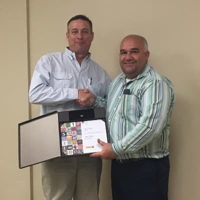 Louis Aguilar (Tampa Service Laborer), left, receiving his award from Brent Kelley for completing 1 year of service in August.