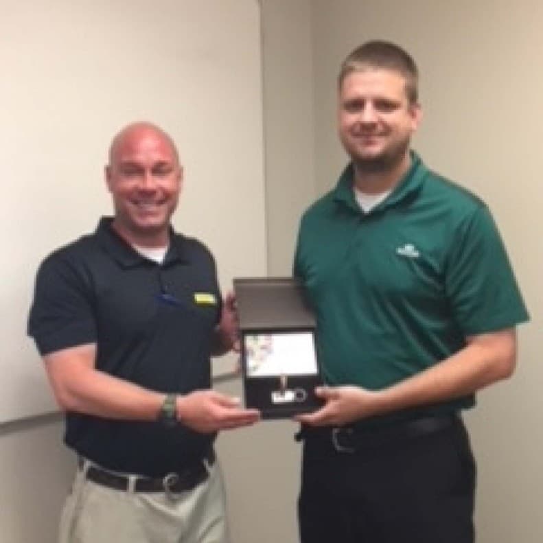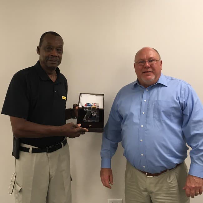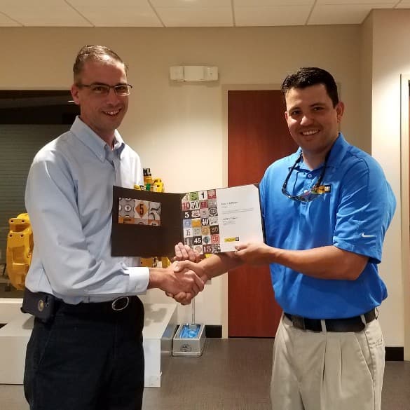 Neal Lewis (Tampa Air Compressor Dispatcher) left, receiving his award from Josh Stockwell for completing 1 year of service July 5.