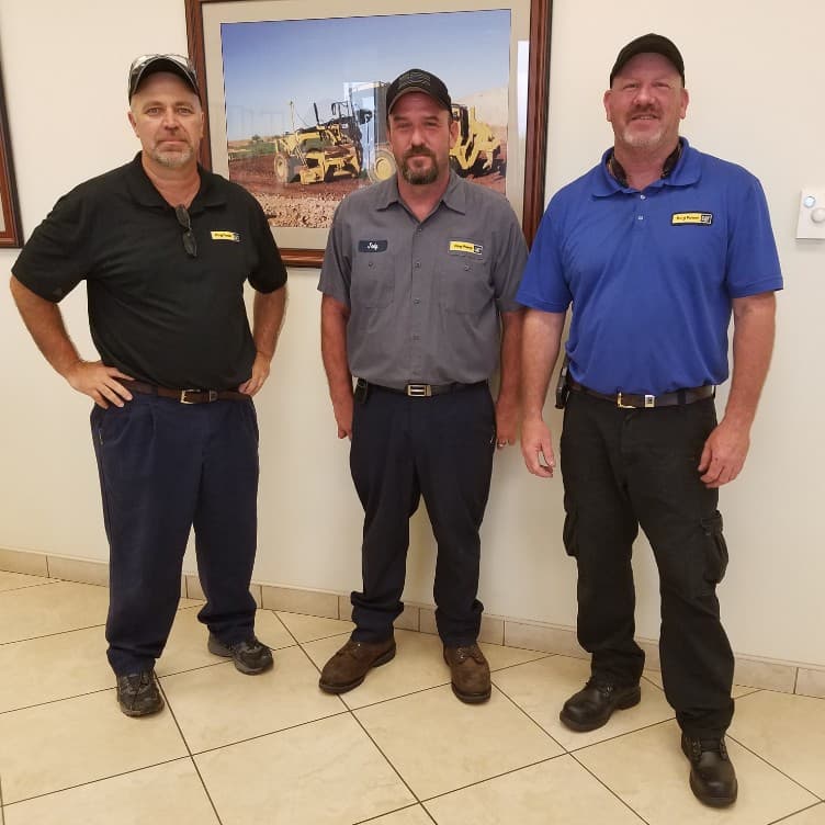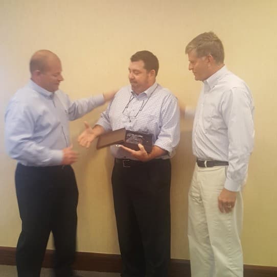 Chris Hobbs (Lakeland Parts Service Expediter), left, receiving his award from Austin Touchton and David Collins for completing 25 years of service June 3.