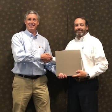 Frank Verk (Palm Bay HE Service Manager) left, receiving his award from Sammy Simmons for completing 20 years of service in July.