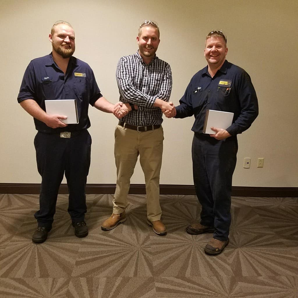Justin Wright (Orlando HE Service Tech II), left, and Mika Hyytiainen (Orlando HE Service Tech II), right, receiving their awards from Dan Jung for completing 1 year of service in June.