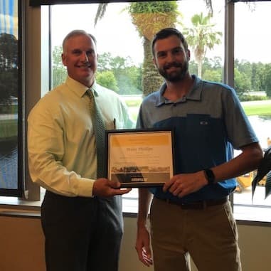 Gabe Sacco (St. Augustine Asst. Tech Training Mgr.), pictured fourth from left, receiving his award from Chip Handley for completing 30 years of service.