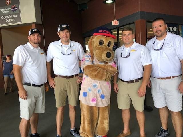 A few members of our Cat Rental Store team caught up the Jumbo Shrimp’s mascot, Southpaw, at the game. Pictured L-R: Luke Pritchett, John DeWitt, Southpaw, John Masley, and Jeff Osborne.