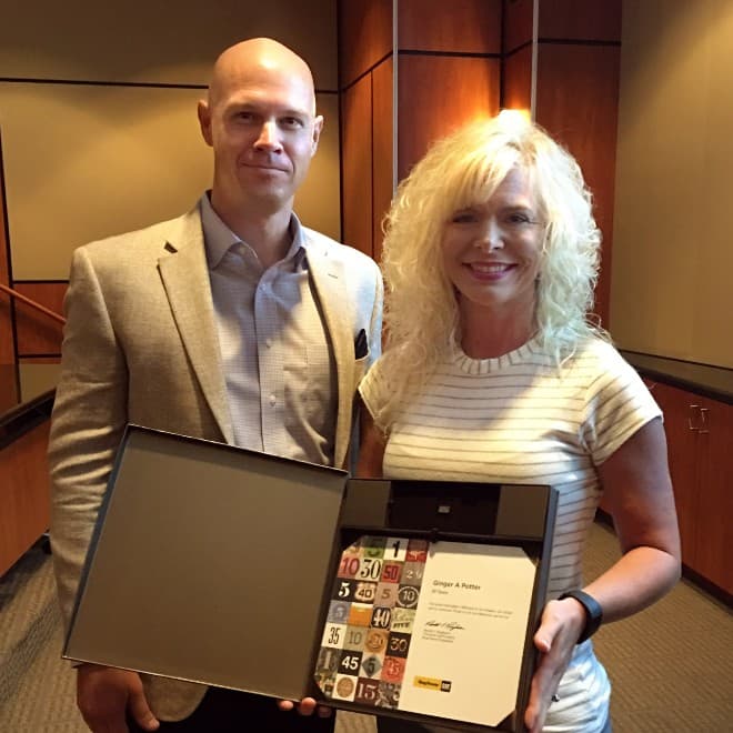 Ginger Potter (Tampa PSD Sales Project Mgr.), right, receiving her award from Jonathan Long for completing 20 years of service June 8.