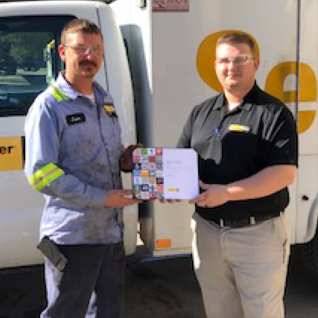 Kyle Sorkness (WCC CRS Service Tech II), right, receiving his award from Kevin McElgun for completing 1 year of service Sept. 30.