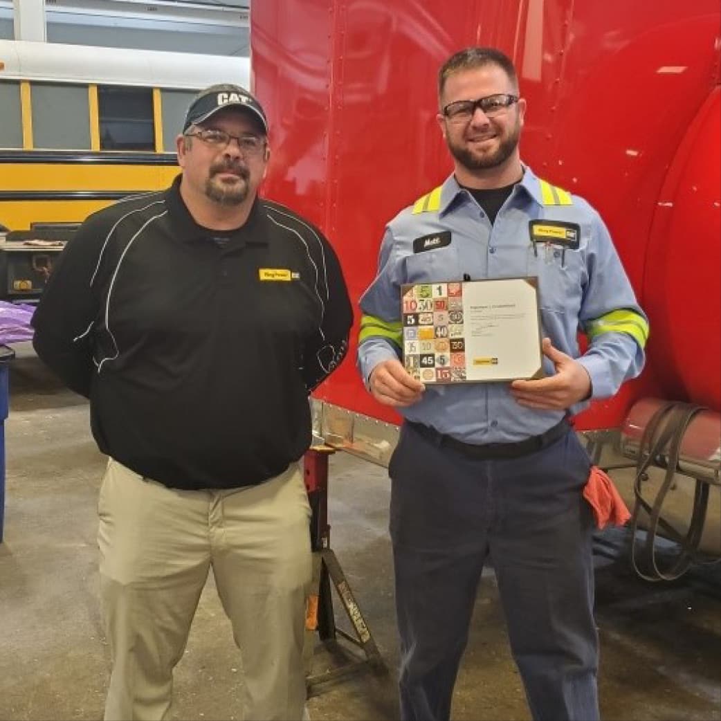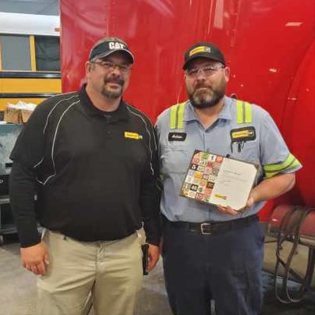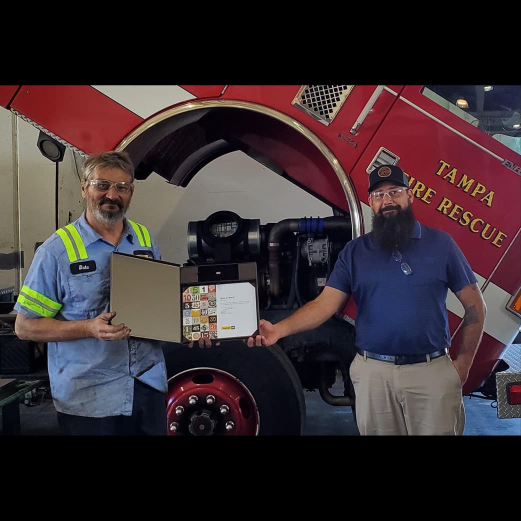 Robert Schneider (Tampa Truck Service Tech I), left, receiving his award from Bryan Dempsey for completing 25 year of service Nov. 6.
