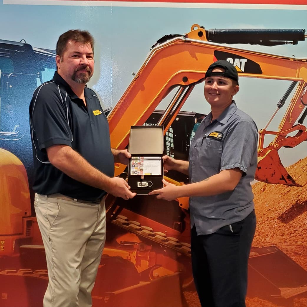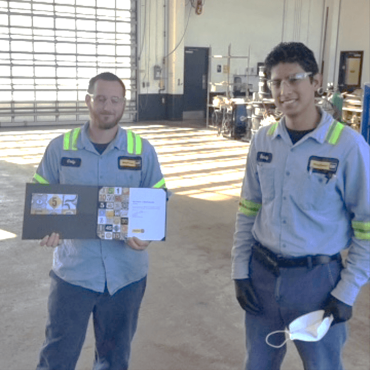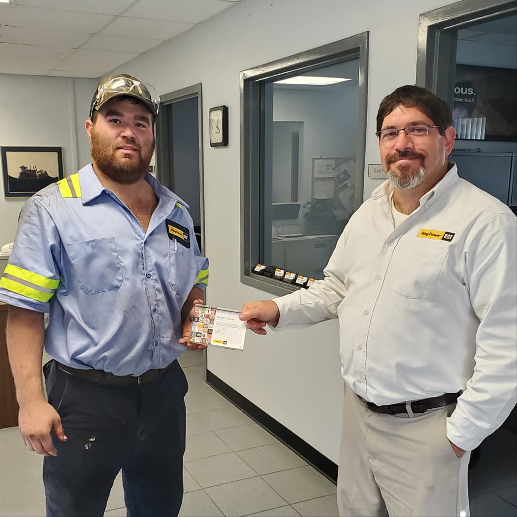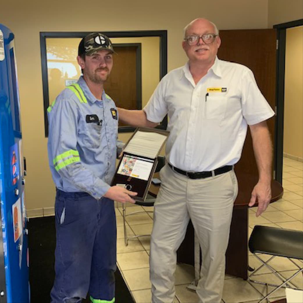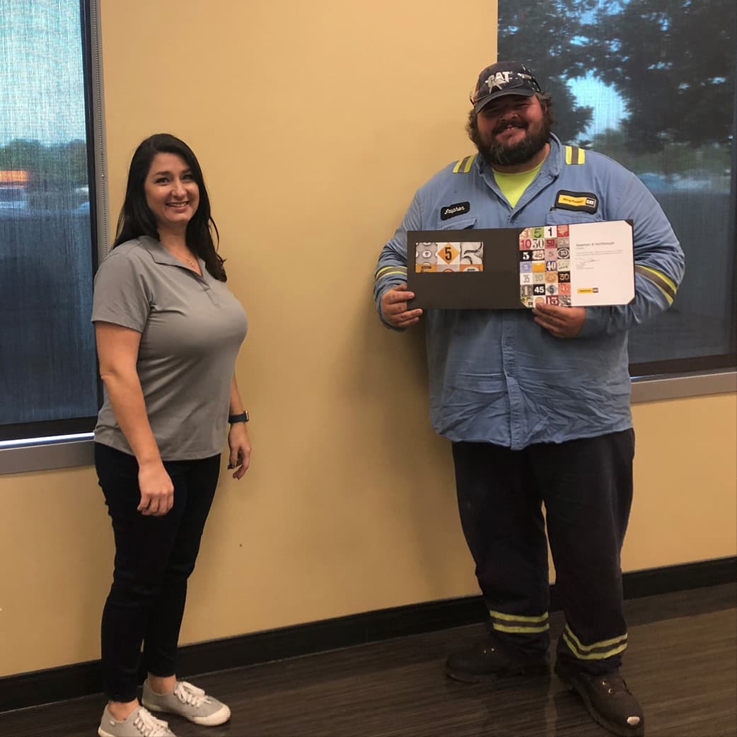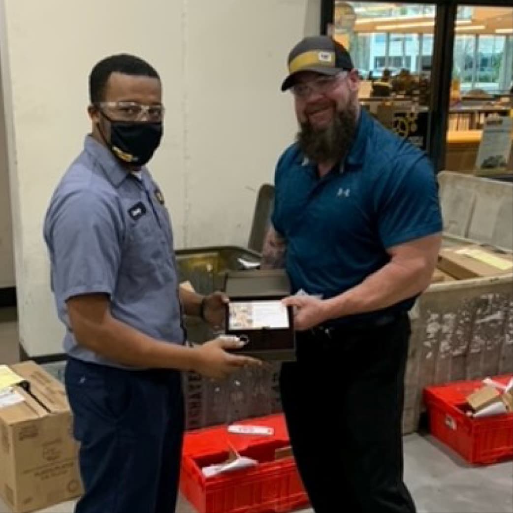 Caray Sparrow (WCC Supply Chain Associate), left, receiving his award from Stacy Green for completing 1 year of service Nov. 19.