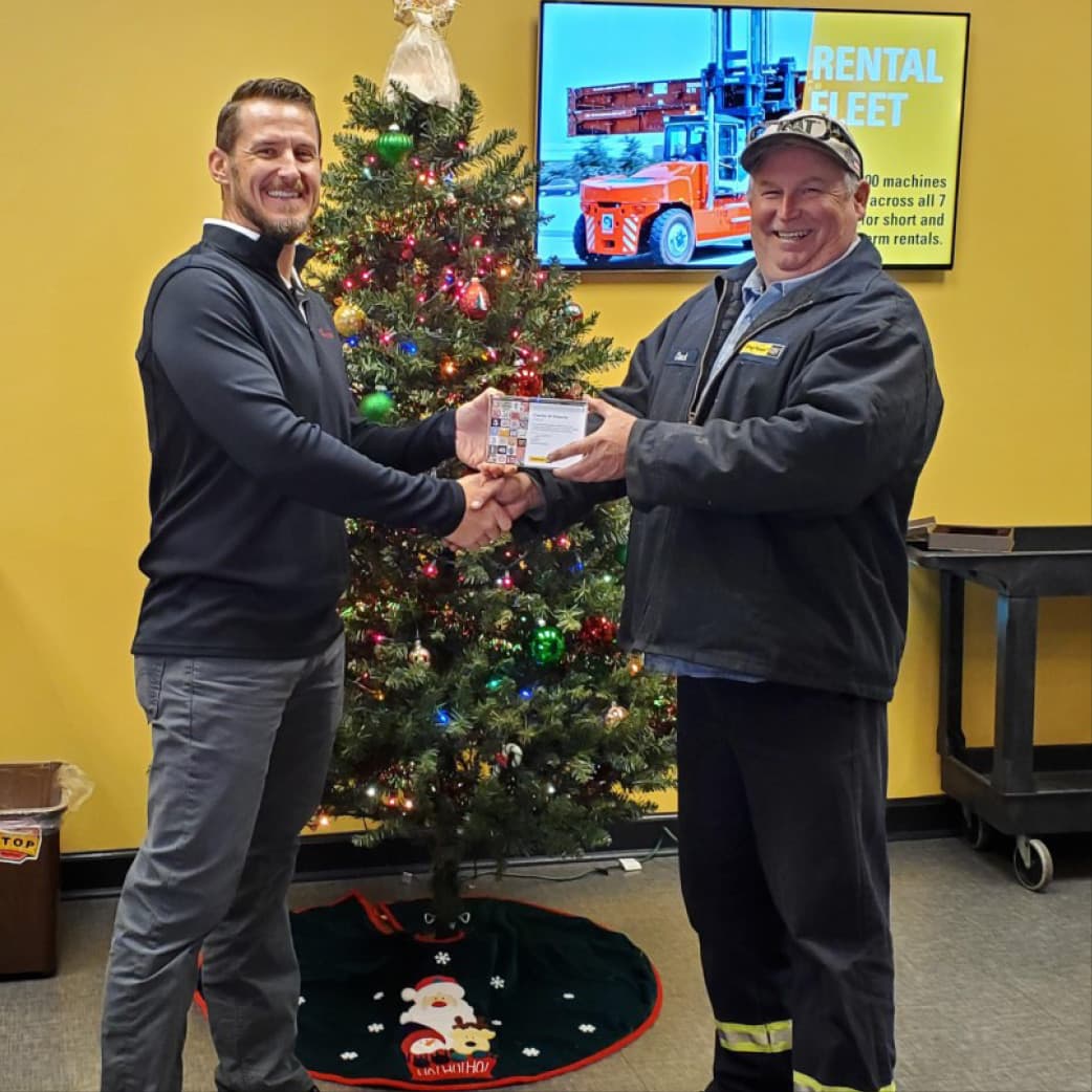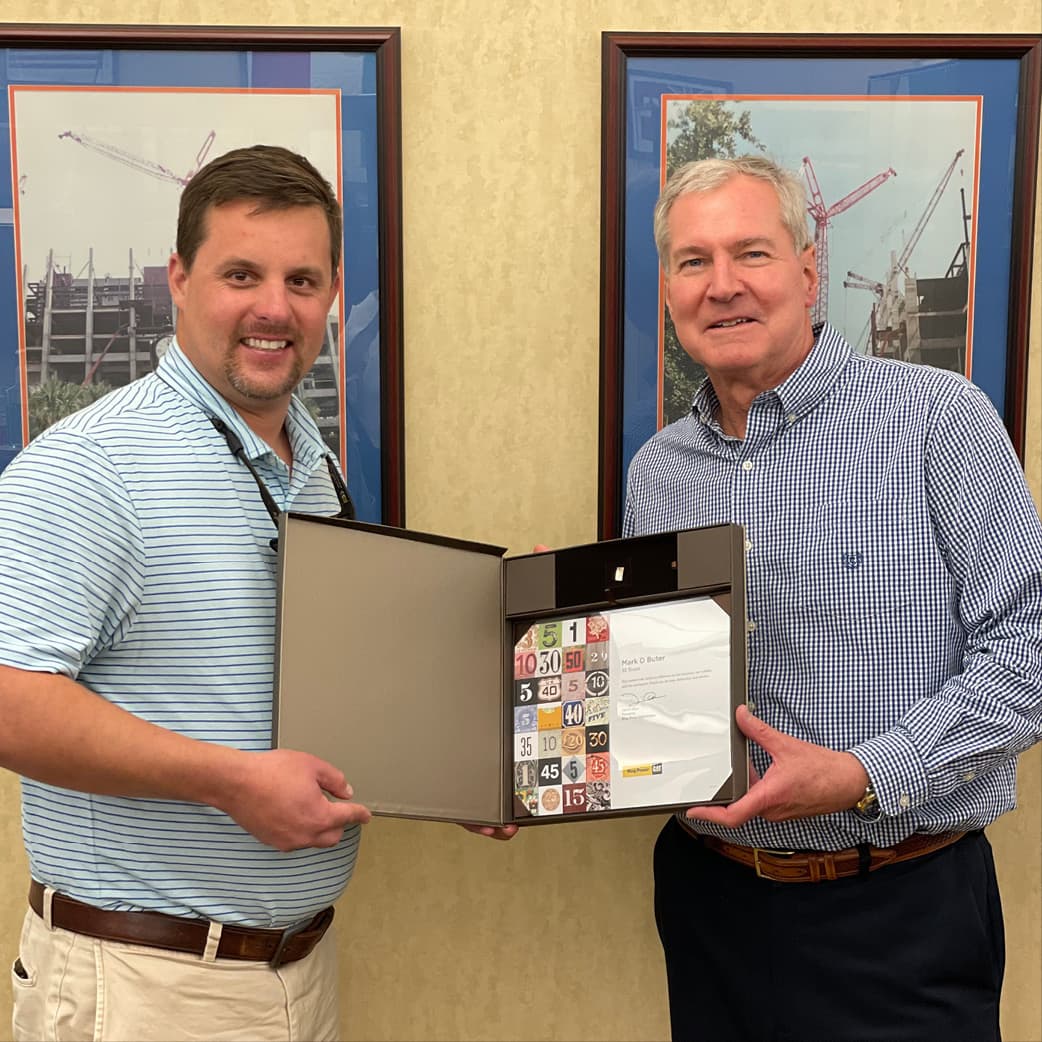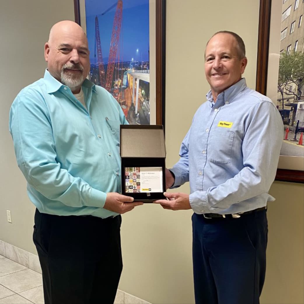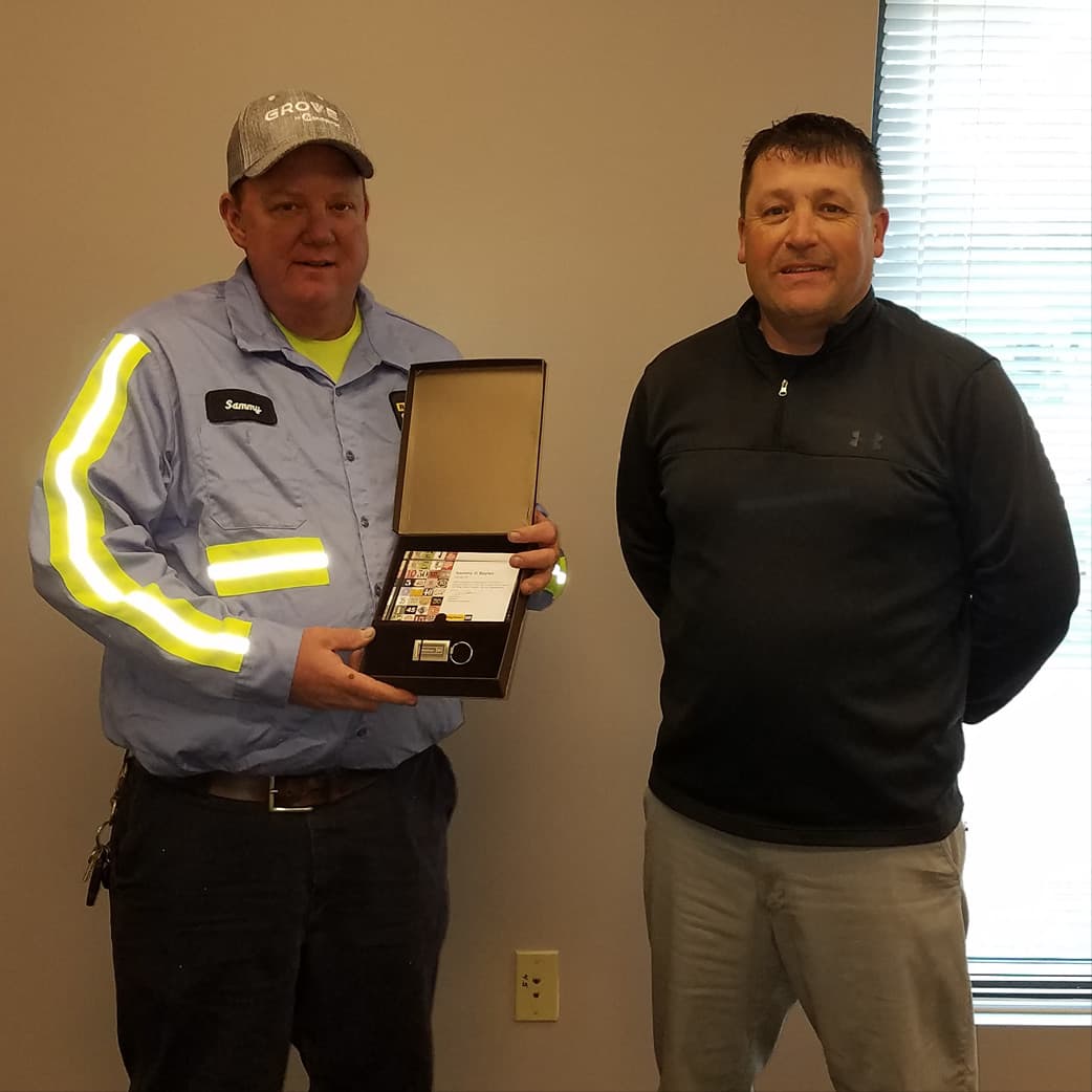 Mark Buter (Tampa Crane Regional Manager), left, receiving his award from Dave Glass for completing 15 years of service Jan. 30.
