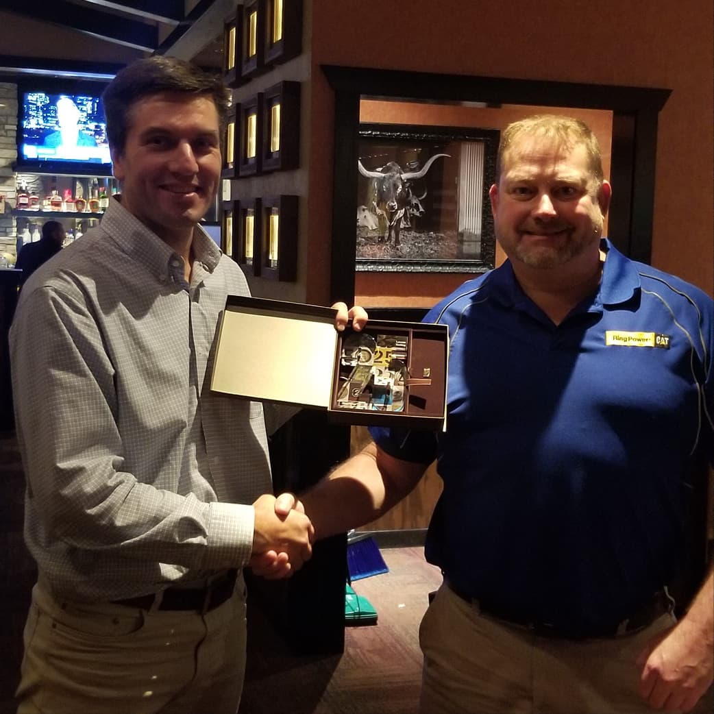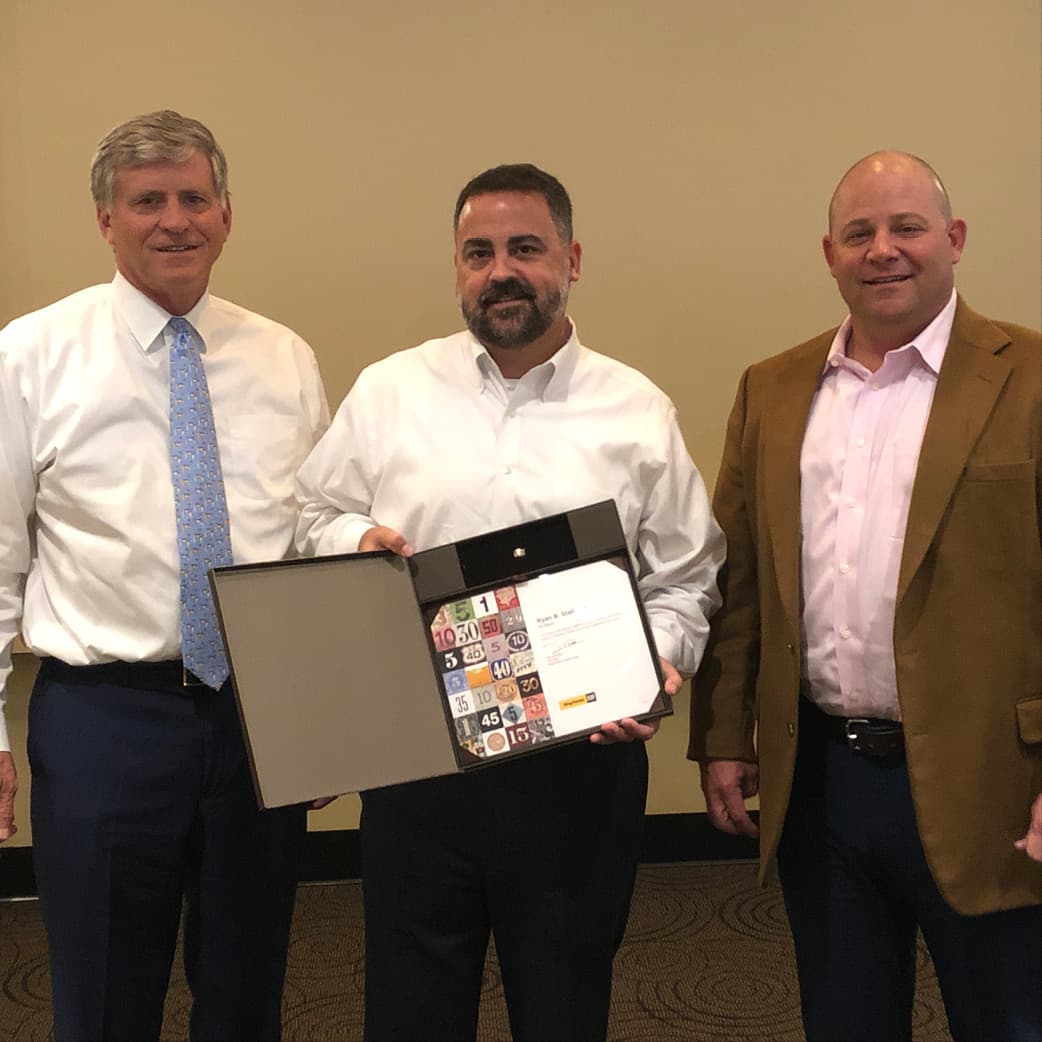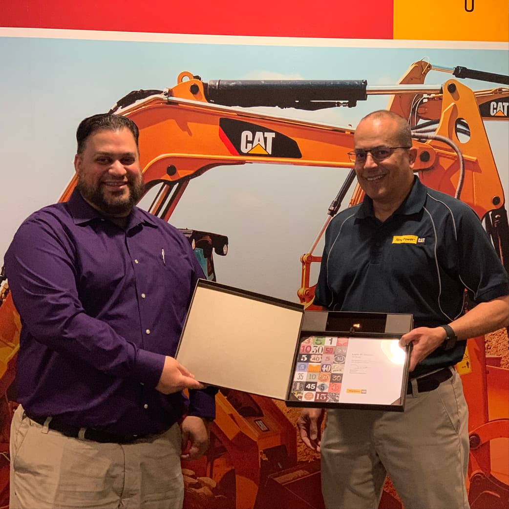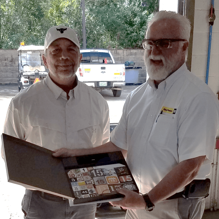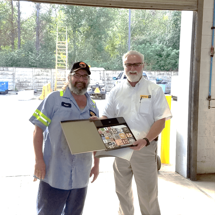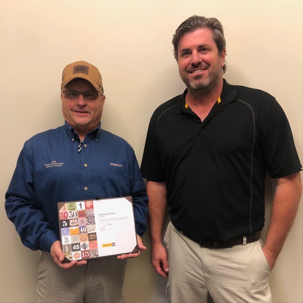 Mark Buter (Tampa Crane Regional Manager), left, receiving his award from Dave Glass for completing 15 years of service Jan. 30.