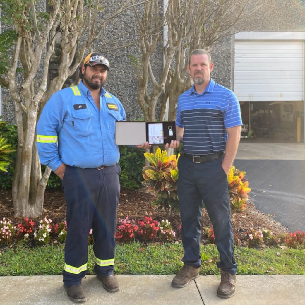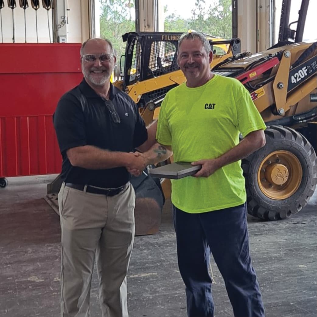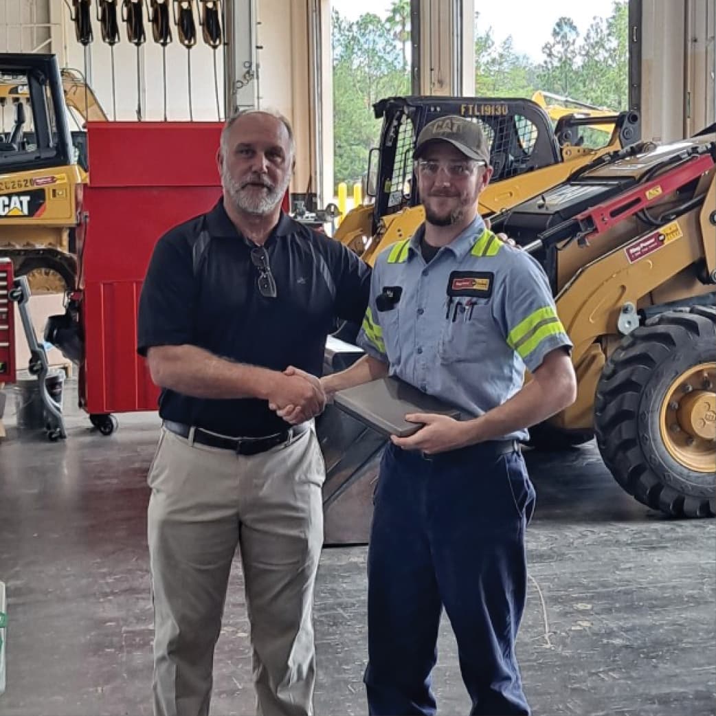 Nicholas Thomson (Ocala CRS Service Tech II), right, receiving his award from Kevin McElgun for completing 1 year of service July 1.
