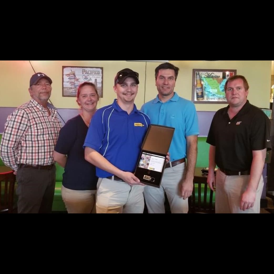 Jacob Peets (WCC HE Service Supervisor Trainee), center, receiving his award from Dan Patin for completing 1 year of service Jan 27. Pictured L-R: Chris Green (WCC HE Service Manager), Kelli Nester (WCC HE PM Dispatcher), Jacob, Dan Patin (WCC HE Service North FL Team Lead), Chris Glass (HE FS Dispatcher).