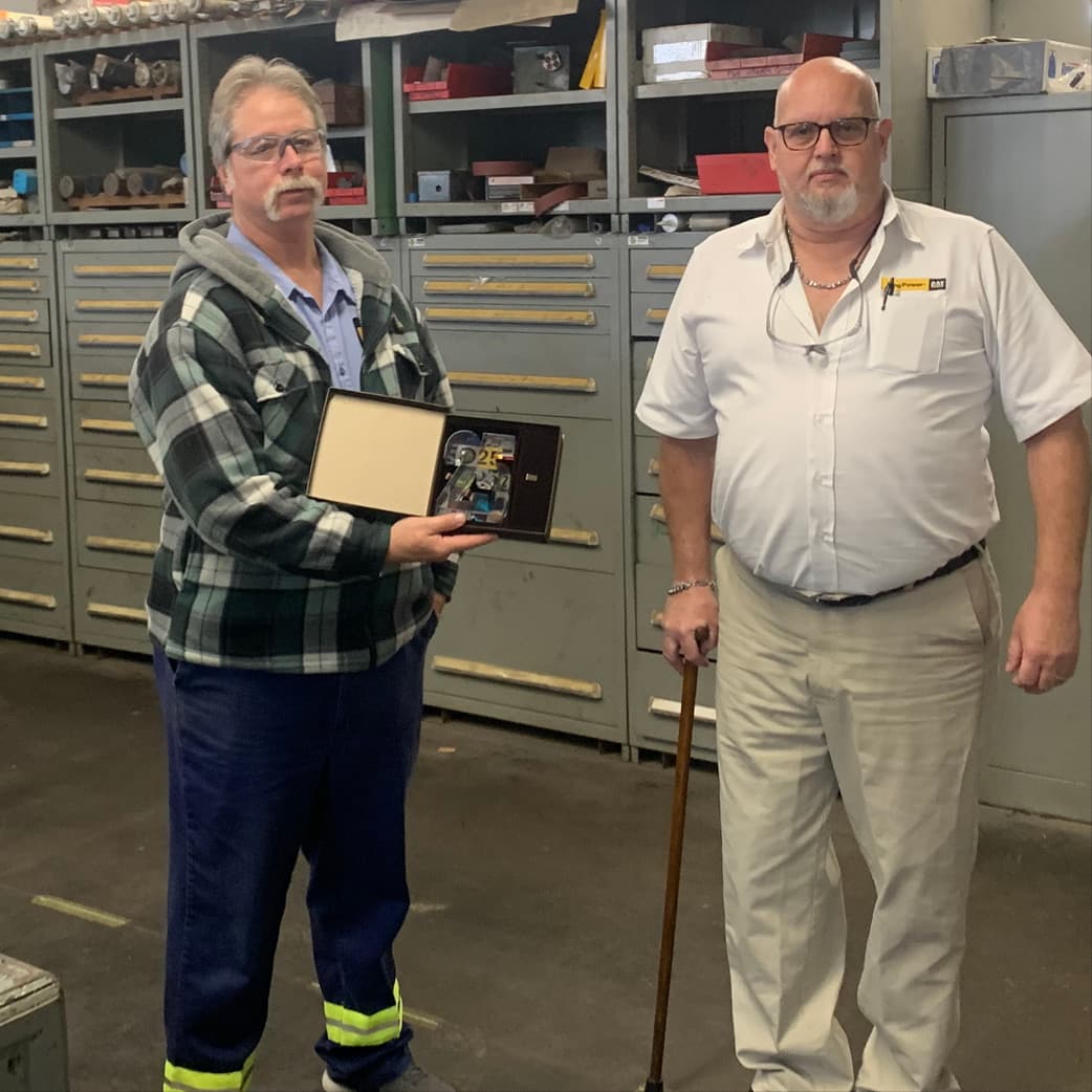 Mark Harden (Tampa Machine Shop Lead), left, receiving his award from Mike Boyd for completing 25 years of service Jan 22.