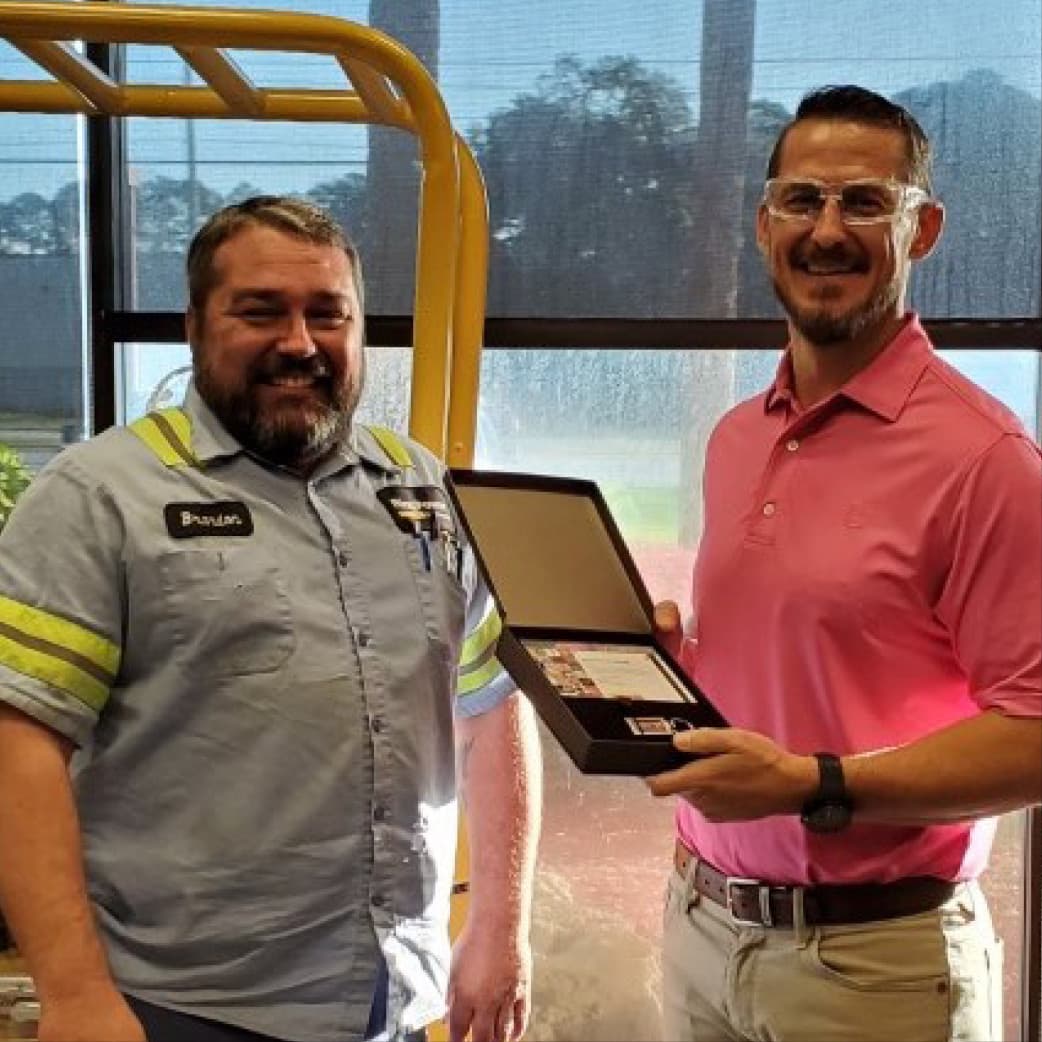 Jean Pierre Narea (Daytona HE Service Tech III), left, receiving his award from David Allen for completing 1 year of service Nov. 25.