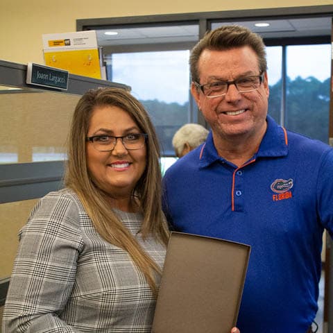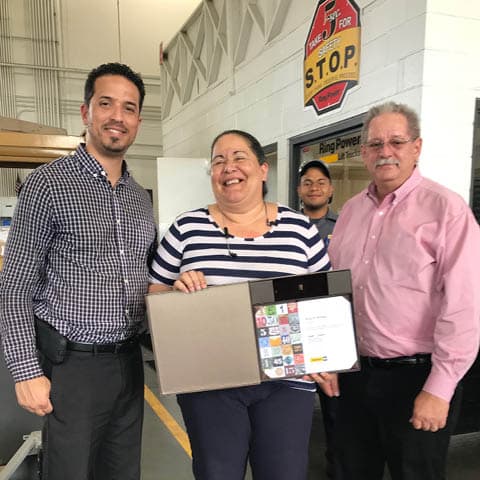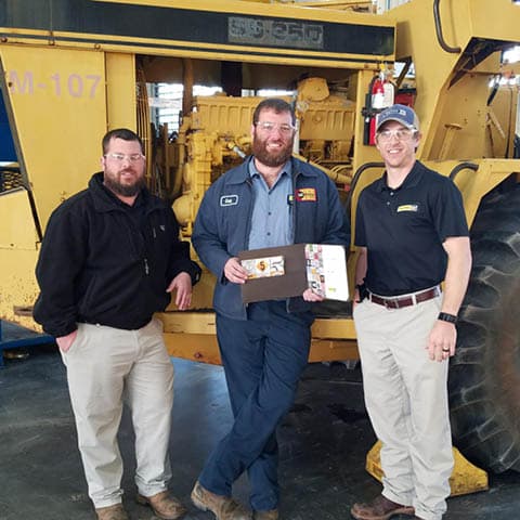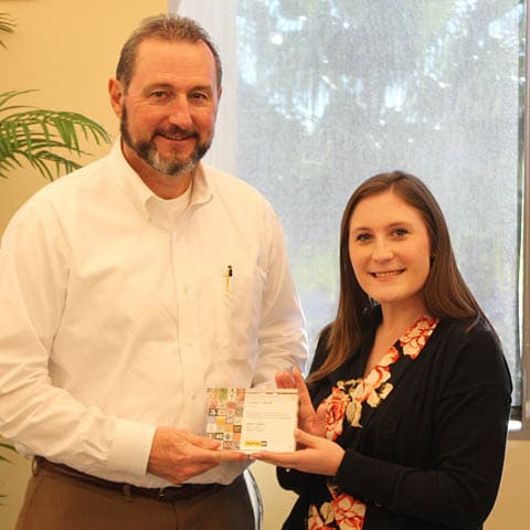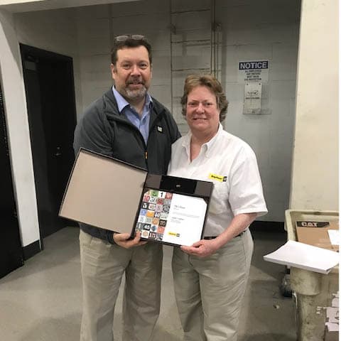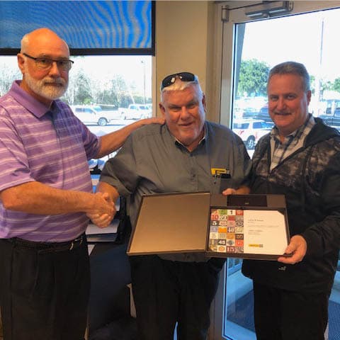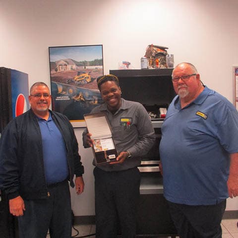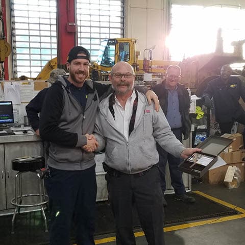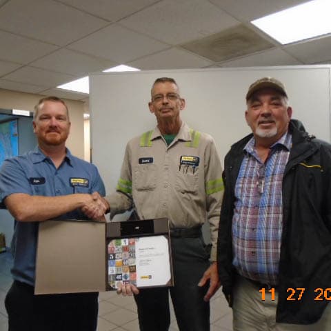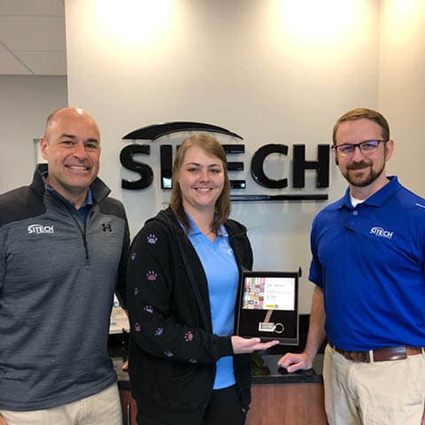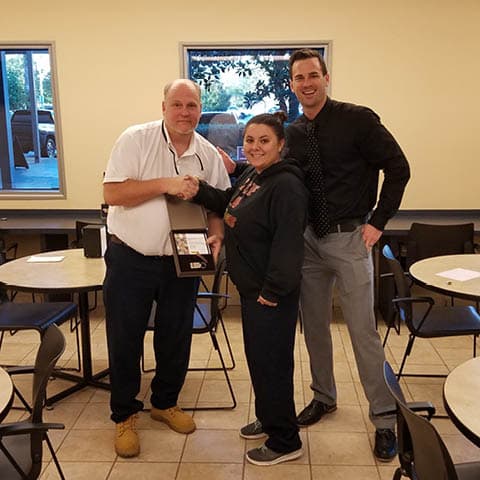 Tiffani Belliveau (Tampa Sitech Software Admin), middle, receiving her award from Rob Curry and Greg Hasty for completing 1 year of service February 5.