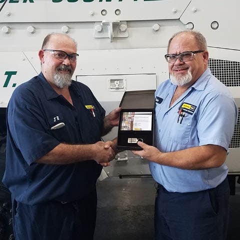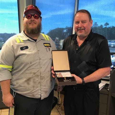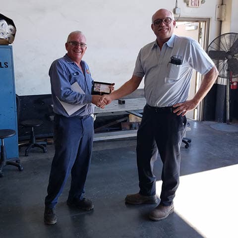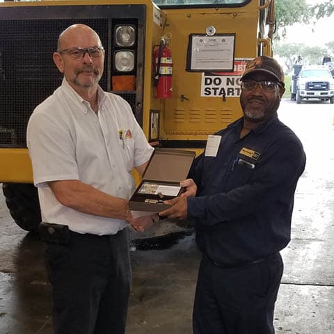 Lake Tollar (Tampa Transport Driver), left, receiving his award from Steve Short for completing 1 year of service Nov. 6.