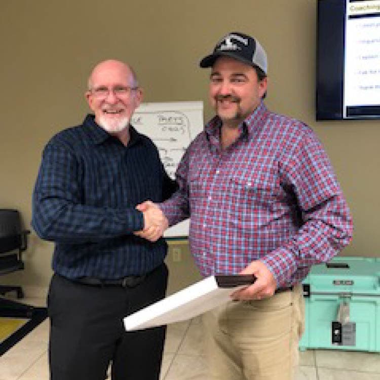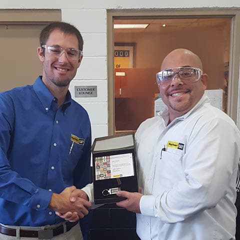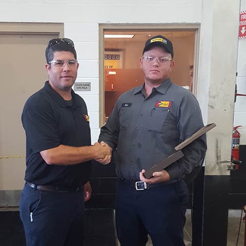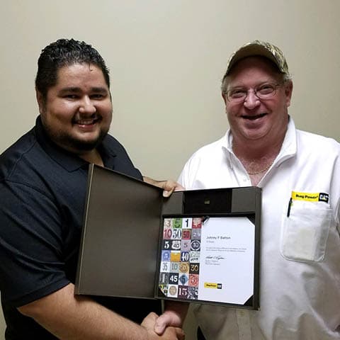 Luis Otero (Pecan Park HE Inside Part Sales Advisor), right, receiving his award from Jason Harley for completing 1 year of service Oct. 16.
