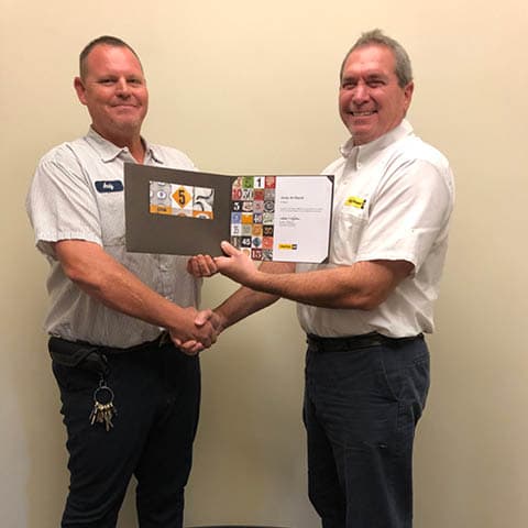 Sean Walls (Pecan Park CRS Yard Attendant), right, receiving his award from Donald Davis for completing 1 year of service Oct. 2.
