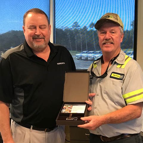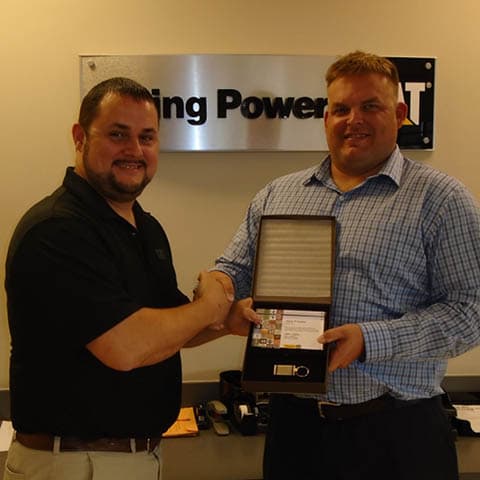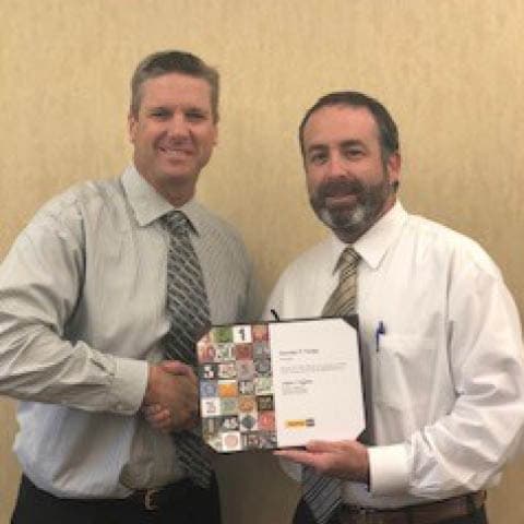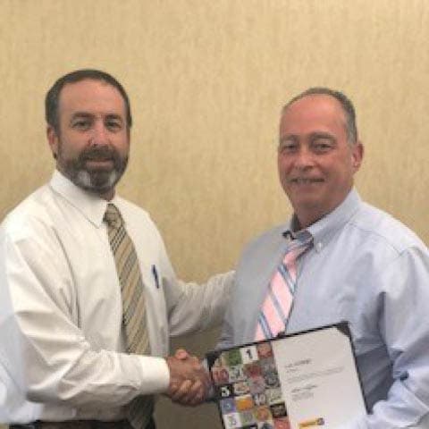 Neil Zinn (Sarasota CRS Service Tech I), left, receiving his award from Butch Peterson for completing 1 year of service Nov. 14.