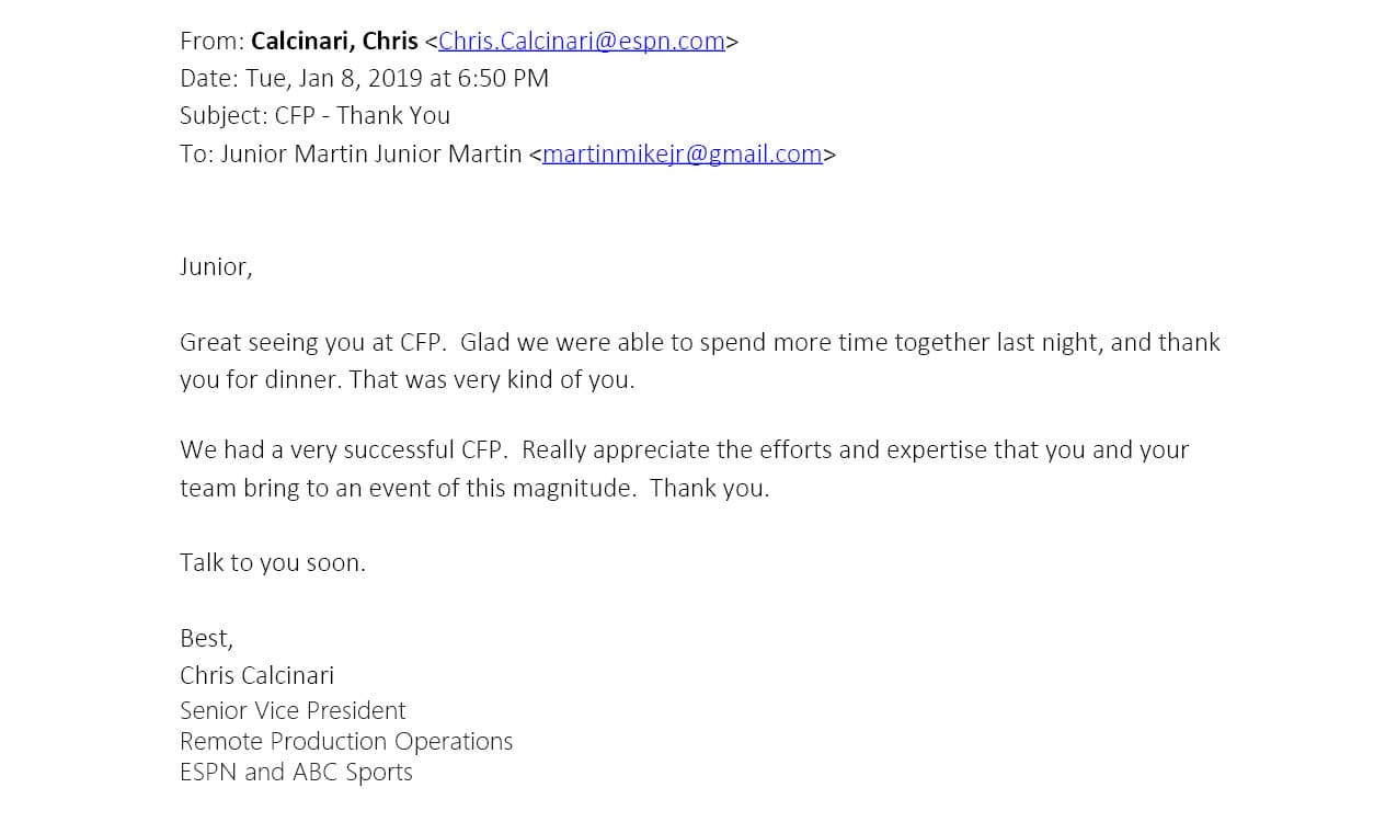 A big thank you from ESPN Senior VP Remote Production Operations, Chris Calcinari, to Michael Martin Jr. (Rhode Island ES Entertainment Tech II) for a great job during the College Football Playoff!