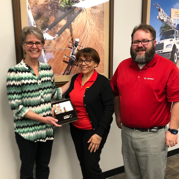 Brenda Baker (WCC ES Project Cost Analyst), center, receiving her award from Burt Bracegirdle and Jay Williams for completing 5 years of service April 27.