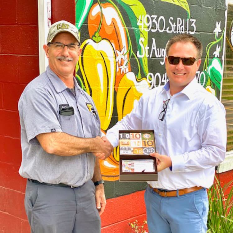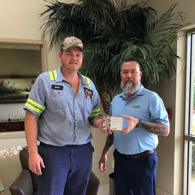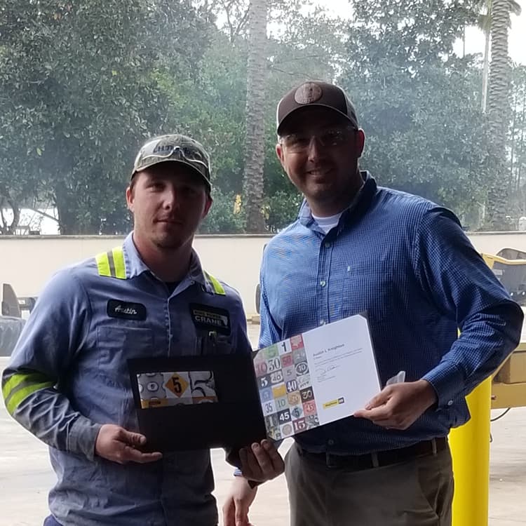 Trey Lynch (Tallahassee CRS Sales Coordinator), right, receiving his award from Ryan Palladino for completing 1 year of service March 5.