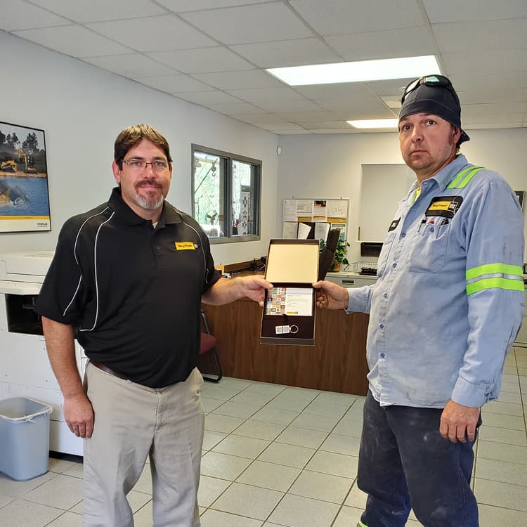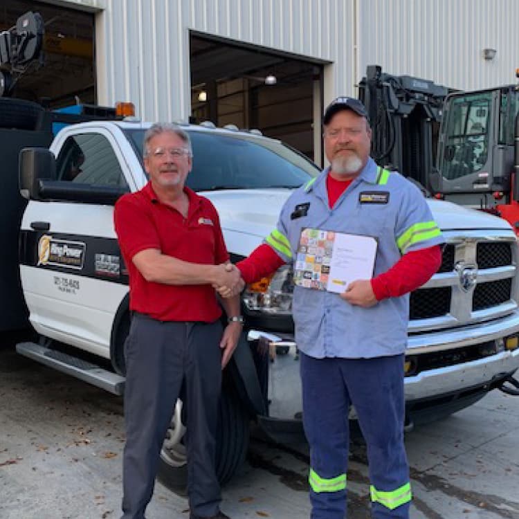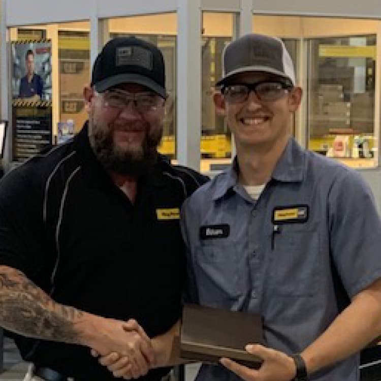 Trey Stoll (Sarasota Truck Service Tech I), right, receiving his award from Jon Beaudry for completing 1 year of service March 12.