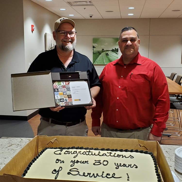 Robert Walker (Parts Warehouse Supervisor), left, receiving his award from Armando Rosado for completing 30 years of service February 7.