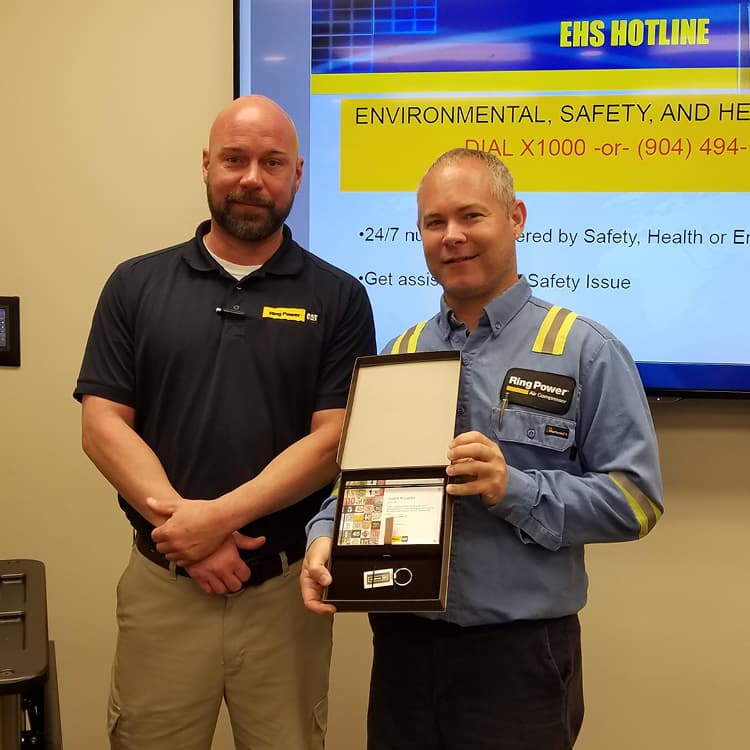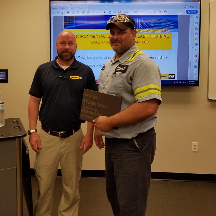 Luke Palmer (Tampa CRS Sales Coordinator), right, receiving his award from Nathan Thomas for completing 1 year of service January 28.