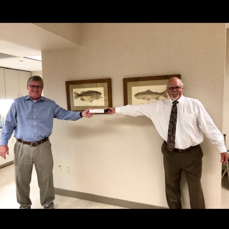 Brian Linehan (Lake City CRS FS Tech I), right, receiving his award from Greg Hill for completing 20 years of service February 7.