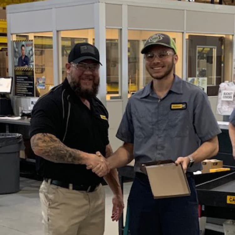 Zach Haley (WCC Supply Chain Associate), right, receiving his award from Stacy Greene for completing 1 year of service January 31.