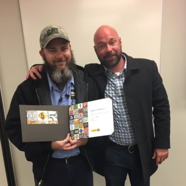 Daniel Stevens (Lake City HE Foreman), left, receiving his award from Tim Bloodworth for completing 5 years of service January 26.