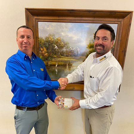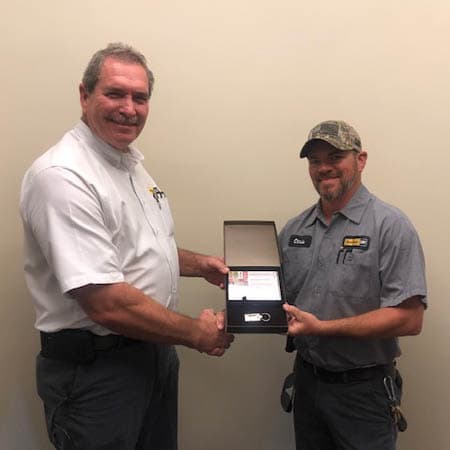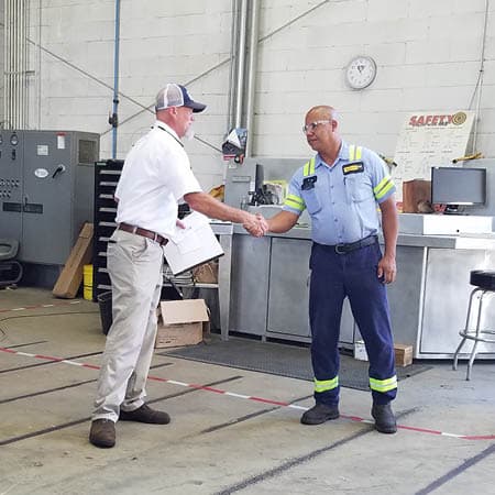 Jeff Gordon (Sarasota CRS Service Tech III), left, receiving his award from Charlie Davis Sr. for completing 1 year of service Sept. 10.