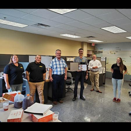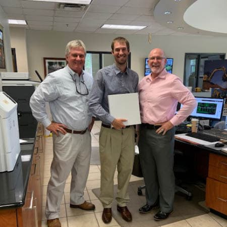 Bill Crowley (Tampa SITECH Sr. Mach. Sup. Sales Rep), center, receiving his award from Robert Curry and Greg Hasty for completing 30 years of service Aug. 30.