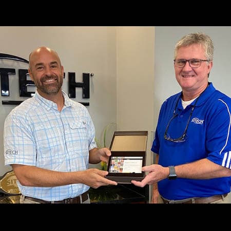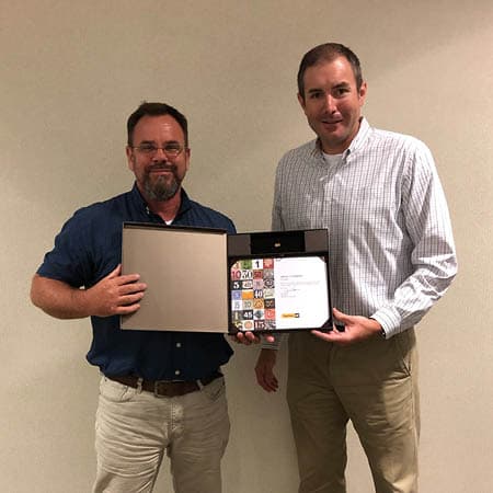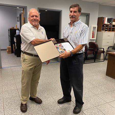 Greg Hasty (Tampa SITECH General Mgr.), left, receiving his award from Hubert Norris for completing 10 years of service Sept. 1.