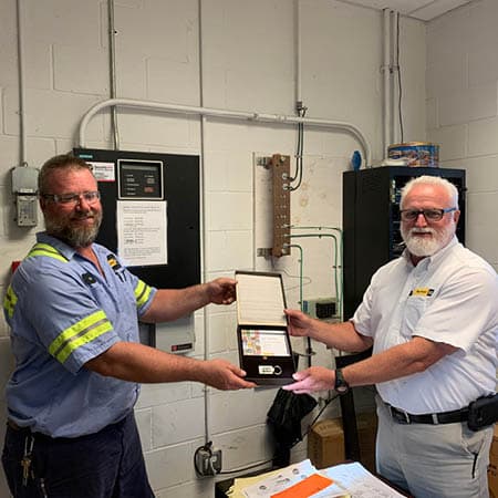 John Hirschmann (WCC Shop Service Leadperson), left, receiving his award from Daryl Gandy for completing 1 year of service Aug. 19.
