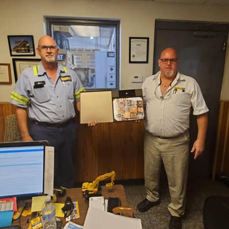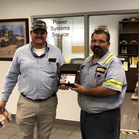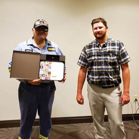 Carlos Madriz (WCC He Hydraulic Shop CS III), left, receiving his award from Rick Seuis for completing 1 year of service Sept. 30.