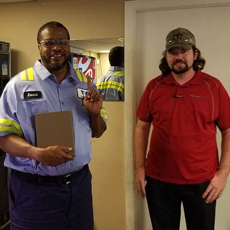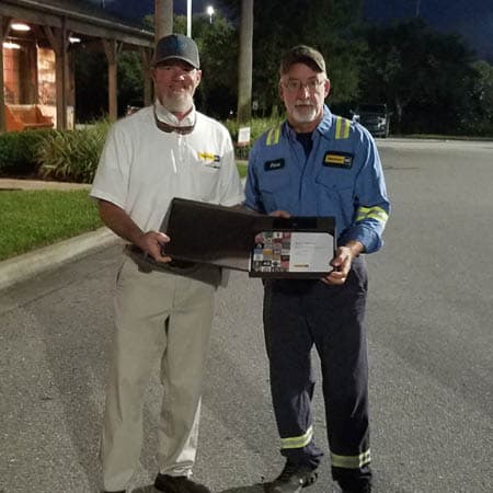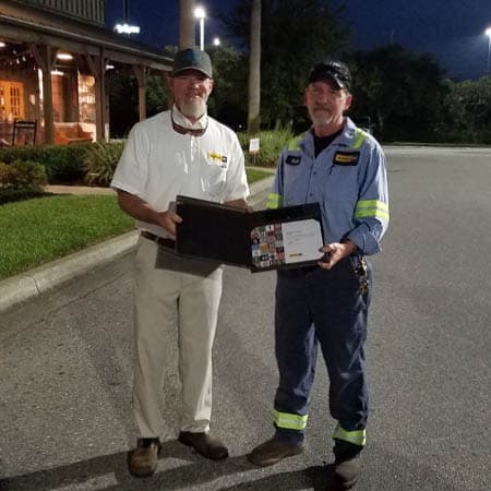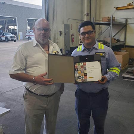 David Fournier (Tampa Parts Truck Driver), right, receiving his award from Richie Bigi for completing 5 years of service Aug. 24.