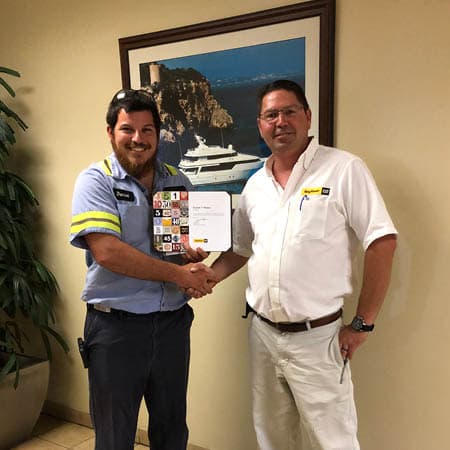 Robert Gay (Jax Phoenix Service Fabricator A), left, receiving his award from Jon Lyman for completing 1 year of service July 29.