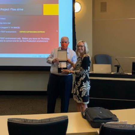 Amber Rich (Orlando PSD Project Coordinator), right, receiving her award from Steve Dorsey for completing 1 year of service Feb. 4.