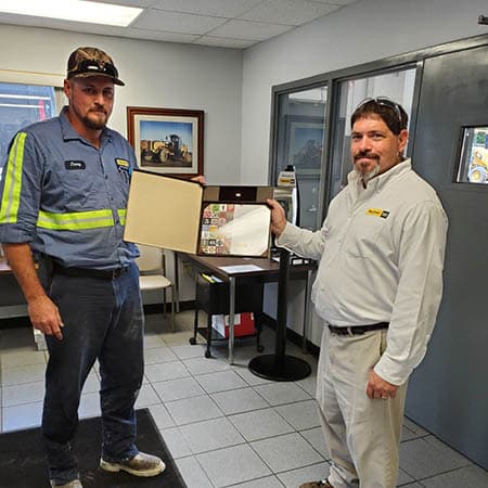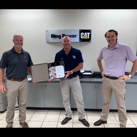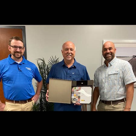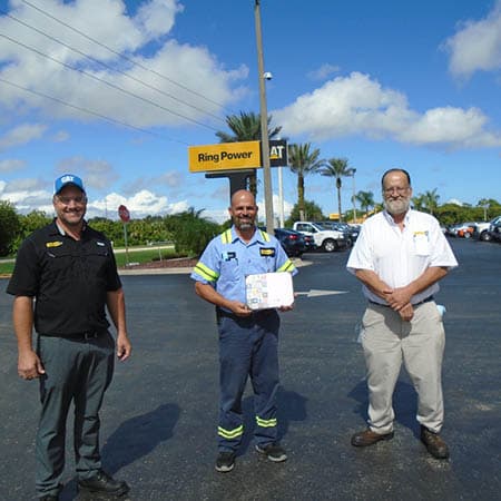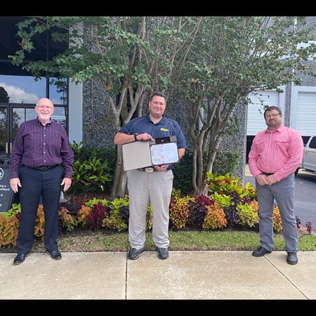 Mike Hamer (Sarasota HE New Equipment Salesperson), center, receiving his award from Bert Hammett and Dylan McCandless for completing 20 years of service July 6.