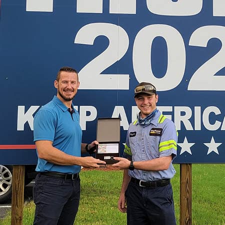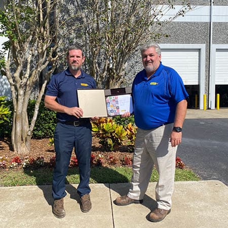 Quintin Foster (Brooksville Supply Chain Associate), right, receiving his award from Kevin Cason for completing 1 year of service Aug. 5.