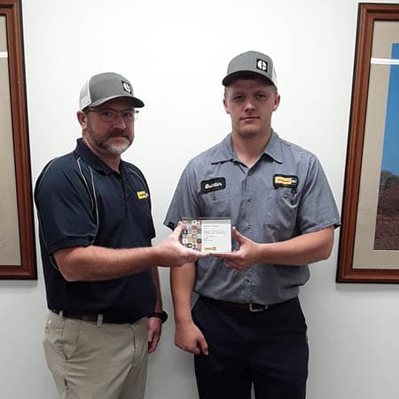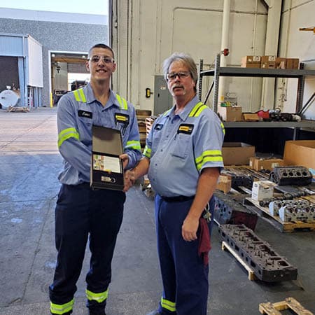 Jaden Henry (Tampa HE Machinist Trainee), left, receiving his award from Mark Harden for completing 1 year of service June 17.