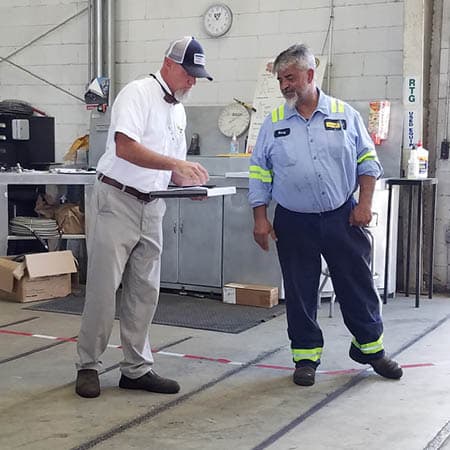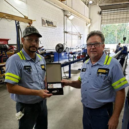 Gabe Marrero (Orlando Truck Service Tech I), left, receiving his award from Jason Conley for completing 30 years of service Aug 6.