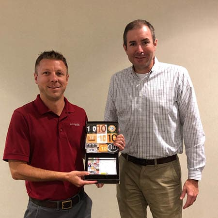 Jeremy Miles (Daytona CRS Account Mgr.), left, receiving his award from John DeWitt for completing 10 years of service Sept. 14.