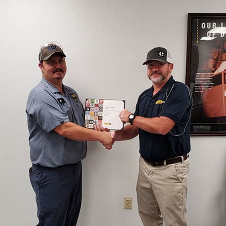 Marvin Parker (Tampa Crane Tech Master), right, receiving his award from Roy Scanlan for completing 15 years of service Aug. 22.
