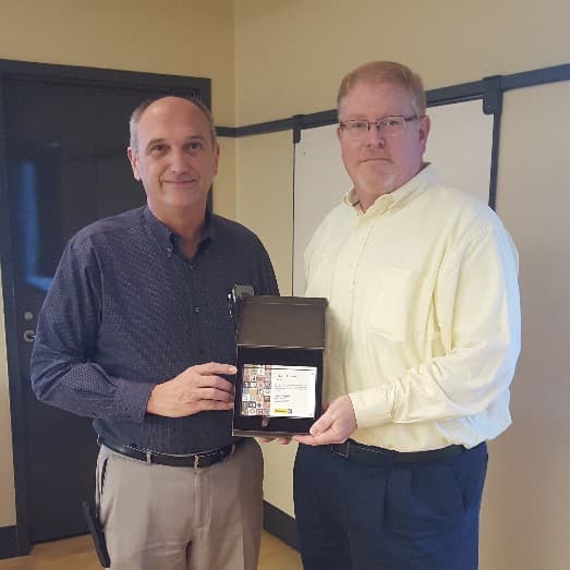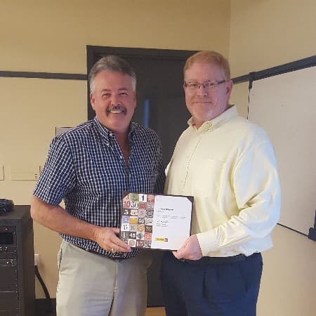 Chris Morter (Jacksonville Phoenix Products Production Manager) on the right, receiving his award from Ben Bristol for completing 10 years of service Feb. 27.