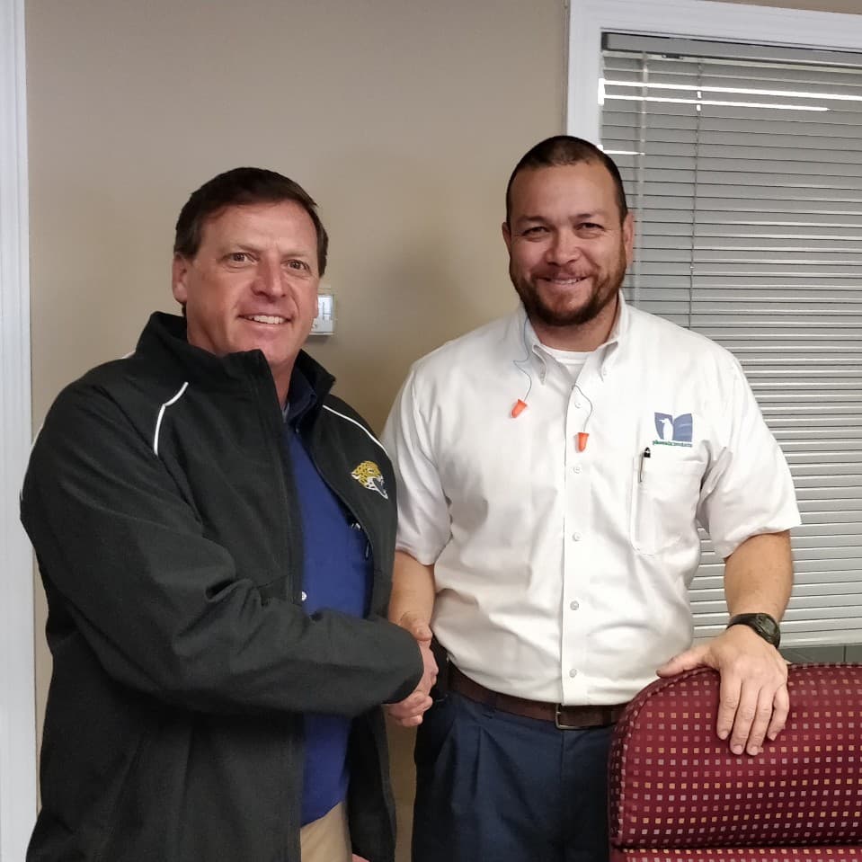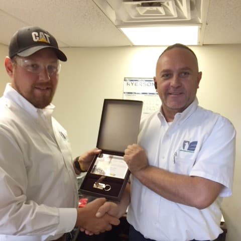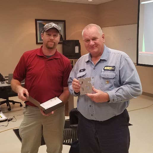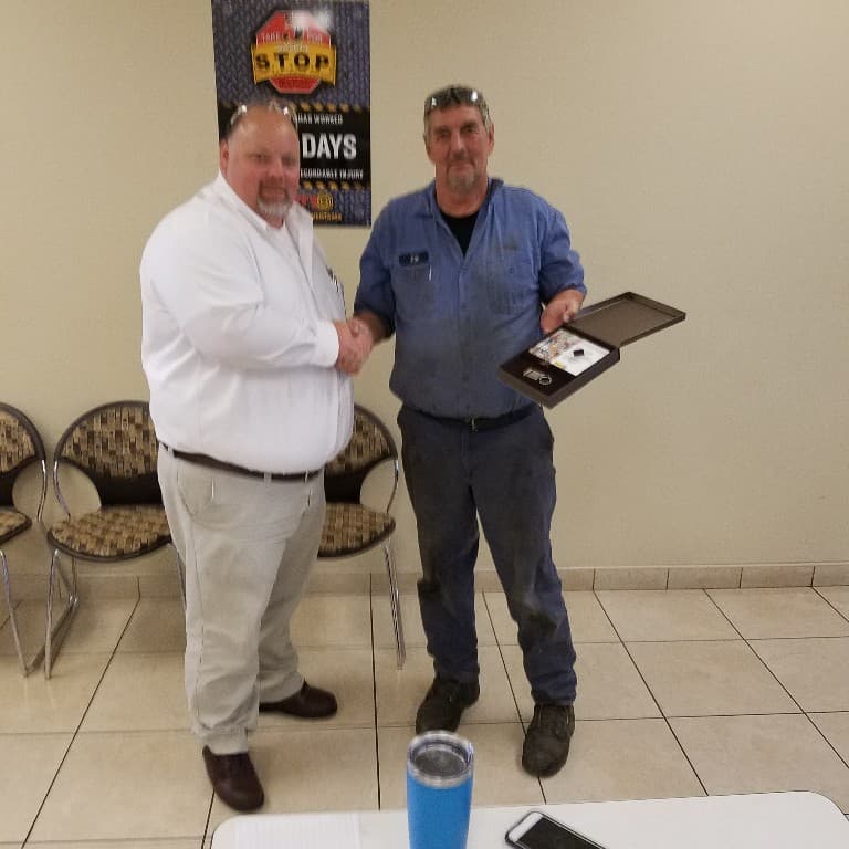 Josh Collins (Jacksonville Phoenix Products Fabrication Shop Lead Person) on the left, receiving his award from Zanin Basic for completing one year of service Oct. 31.