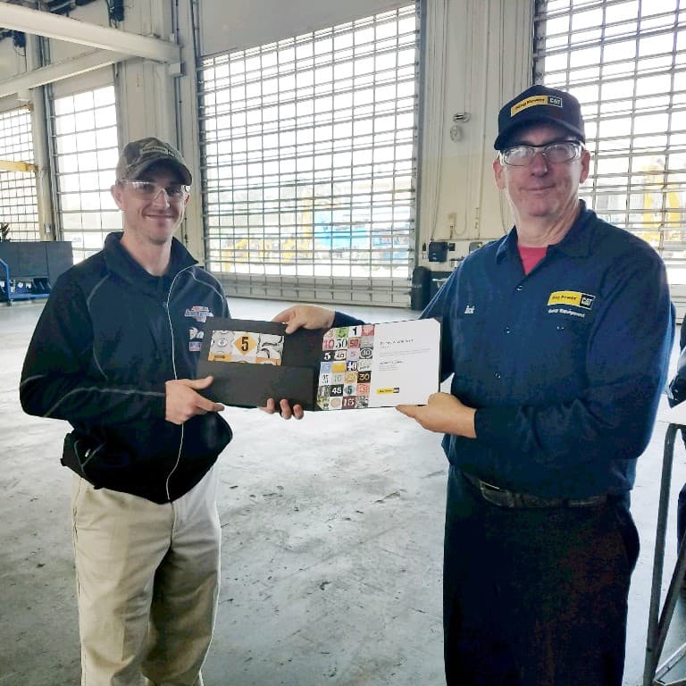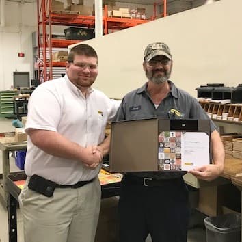Brennon Cook (Brooksville Parts Supply Chain Assoc.) on the left, receiving his award from Kevin Cason for completing one year of service Feb. 6.
